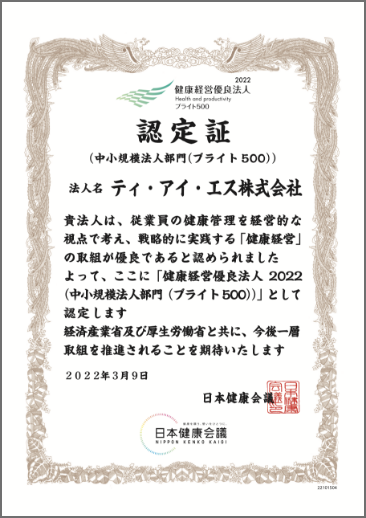 ティ・アイ・エス株式会社は、経済産業省が日本健康会議と共同で、保険者と連携して、健康経営を実践している優良な中小企業のうち上位500社の法人を顕彰する「健康経営優良法人ブライト500」に、5年連続で認定されました。
